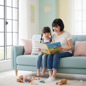 Dành thời gian đọc sách, kể chuyện với trẻ theo cách gần gũi, sử dụng giọng điệu hấp dẫn và đặt câu hỏi để trẻ tham gia tương tác. Đây là phương pháp giúp trẻ phát triển vốn từ, khả năng tưởng tượng và rèn luyện kỹ năng nghe.